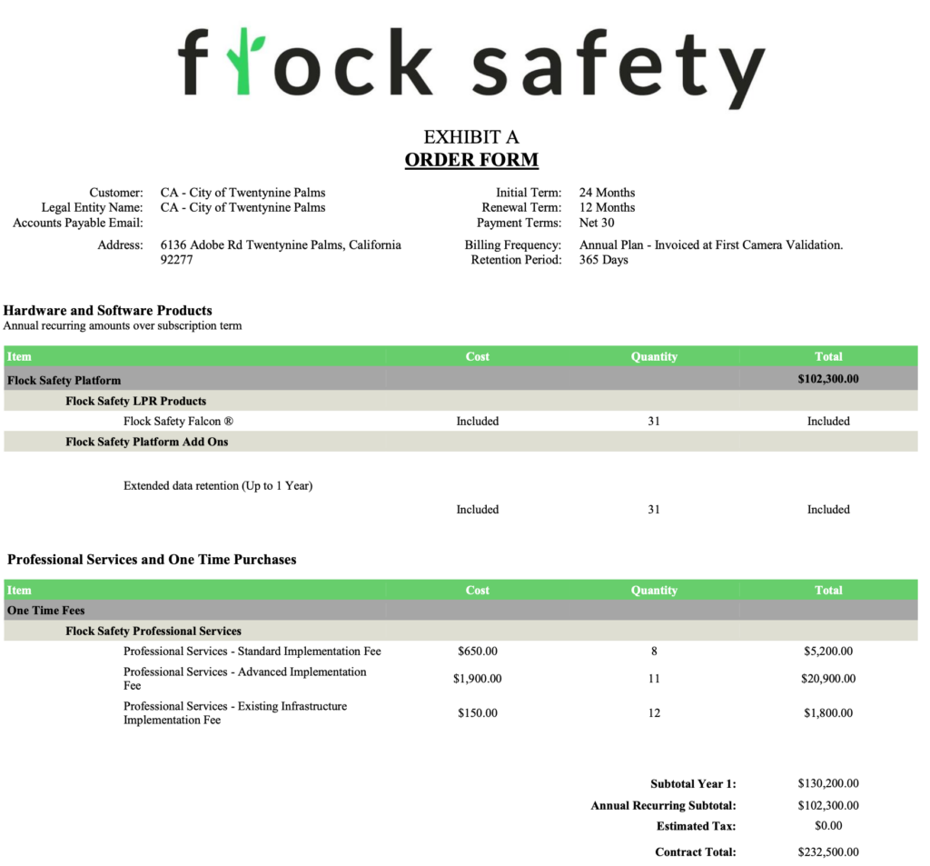 The contract between Flock and 29 Palms includes an MSA (Master Service Agreement) with an older version of their terms. (Linked below in the staff report.) Since that time, in contracts with other cities (including Yucca Valley), Flock has shifted to online terms, which weaken privacy protections, granting Flock more abilities to use and share the data with third parties. It’s very likely Flock will try to switch to online terms at the next renewal.